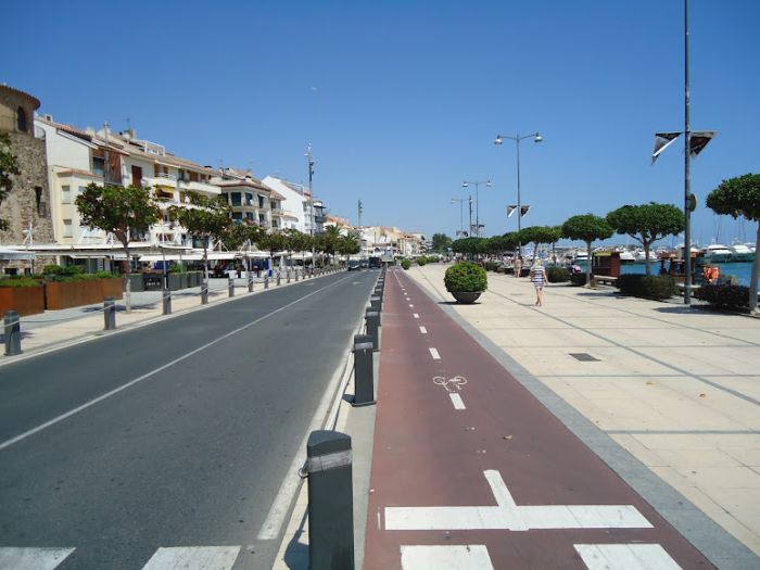 Велодорожки есть не везде, на основных проездах и там, где посчитали лучше отделить нашего брата от машин и пешеходов. Но их много и они качественные. Вот например, велодорожка вдоль главной прибрежной улицы в Салоу. Обратите внимание, как она выделена: по цвету, столбиками, знаками, по расположению.