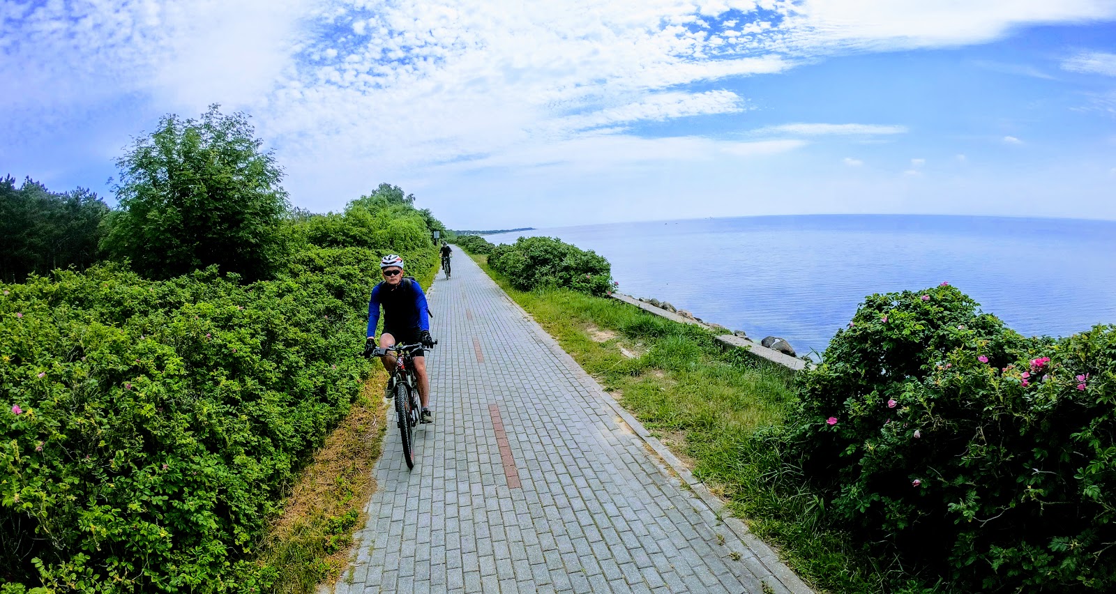 От паромной переправы до Собешево замечательная велодорожка вдоль (в этот день) не шумной трассы. Островной пляж - теплый песок, приличные волны, но в ветер не все любят купаться.