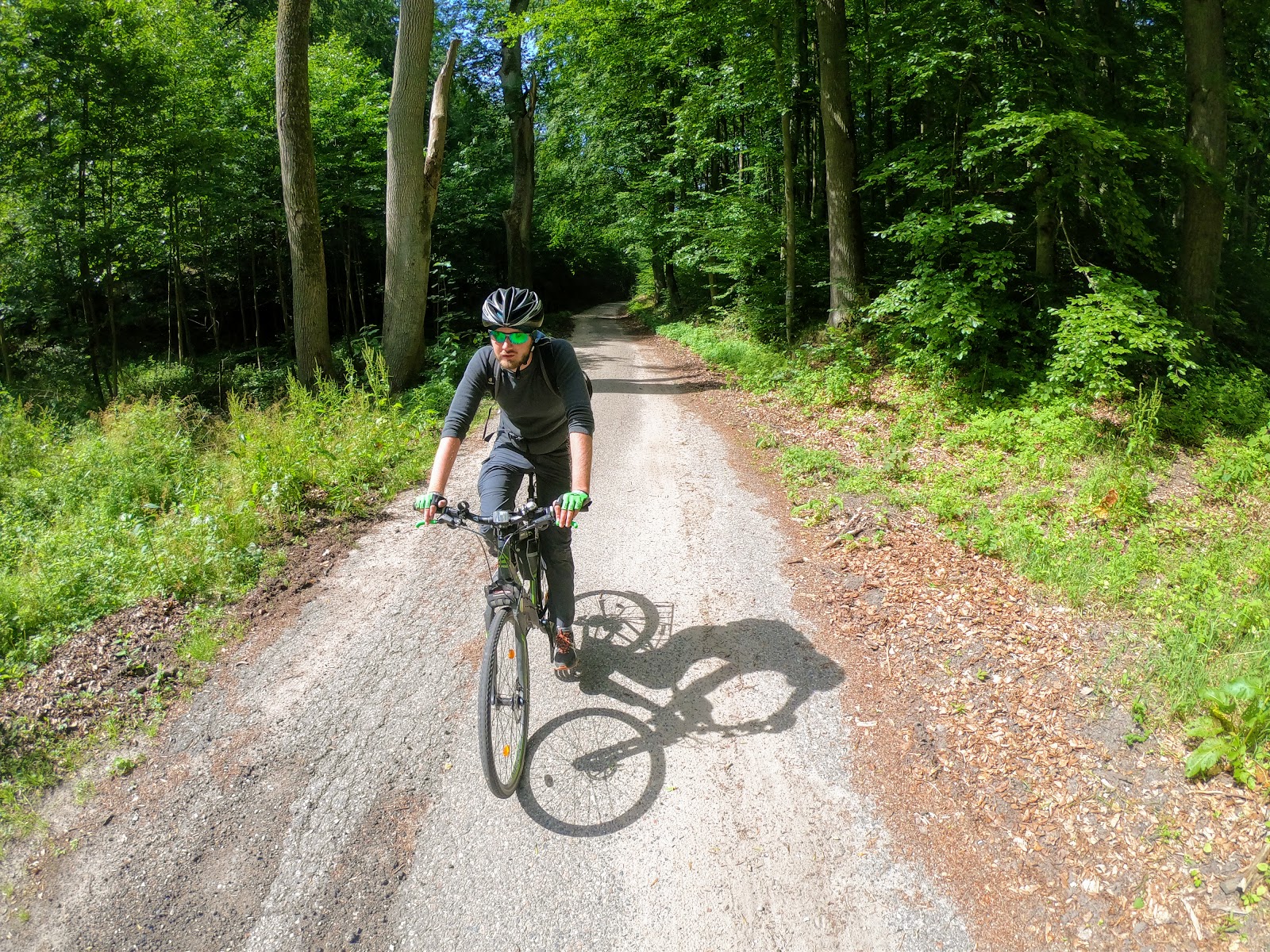 Первые 20 км трека через Пущу. Вначеле понемногу поднимались по рельфу, а потом замечательный многосерийный спуск по лесу. Несколько раз спугнули косуль, совсем-совсем рядом. Сладкая красная земляника. Черника пока зелёная и мелкая. Дальше были поля и стая ветряков...