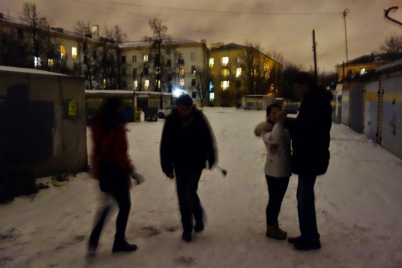 Уже на подходе к гаражу видно, что в его закутке какая-то жизнь происходит и видны светящие велофары.