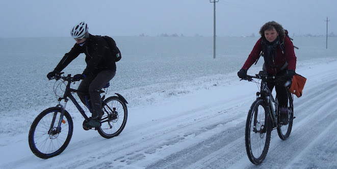 А мы видели это вживую. Потрясающе. Спокойно падали крупные хлопья снега, а вода, словно время нас, поглощала его целиком и без колебаний поверхности. Потом пошли полевые дороги. Как в том стишке: